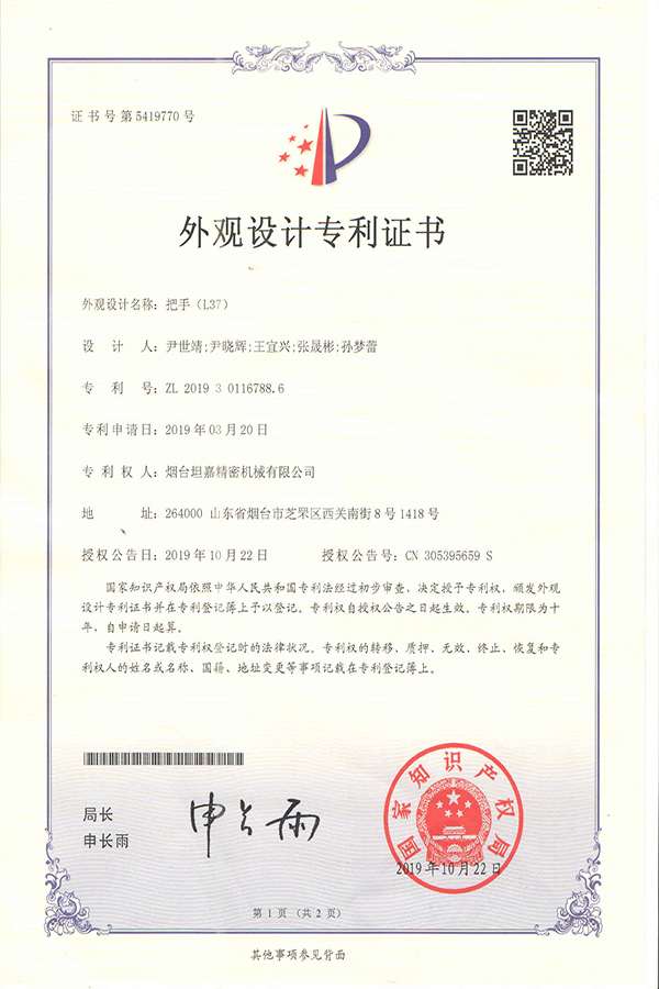 坦嘉精密于2019年10月22日,把手L37外觀設(shè)計(jì)專利順利通過國家知識(shí)產(chǎn)權(quán)局審查并獲得授權(quán),在公司團(tuán)隊(duì)不斷努力下,我司在產(chǎn)品自主設(shè)計(jì)和創(chuàng)新方面又一次取得專業(yè)性的突破。
