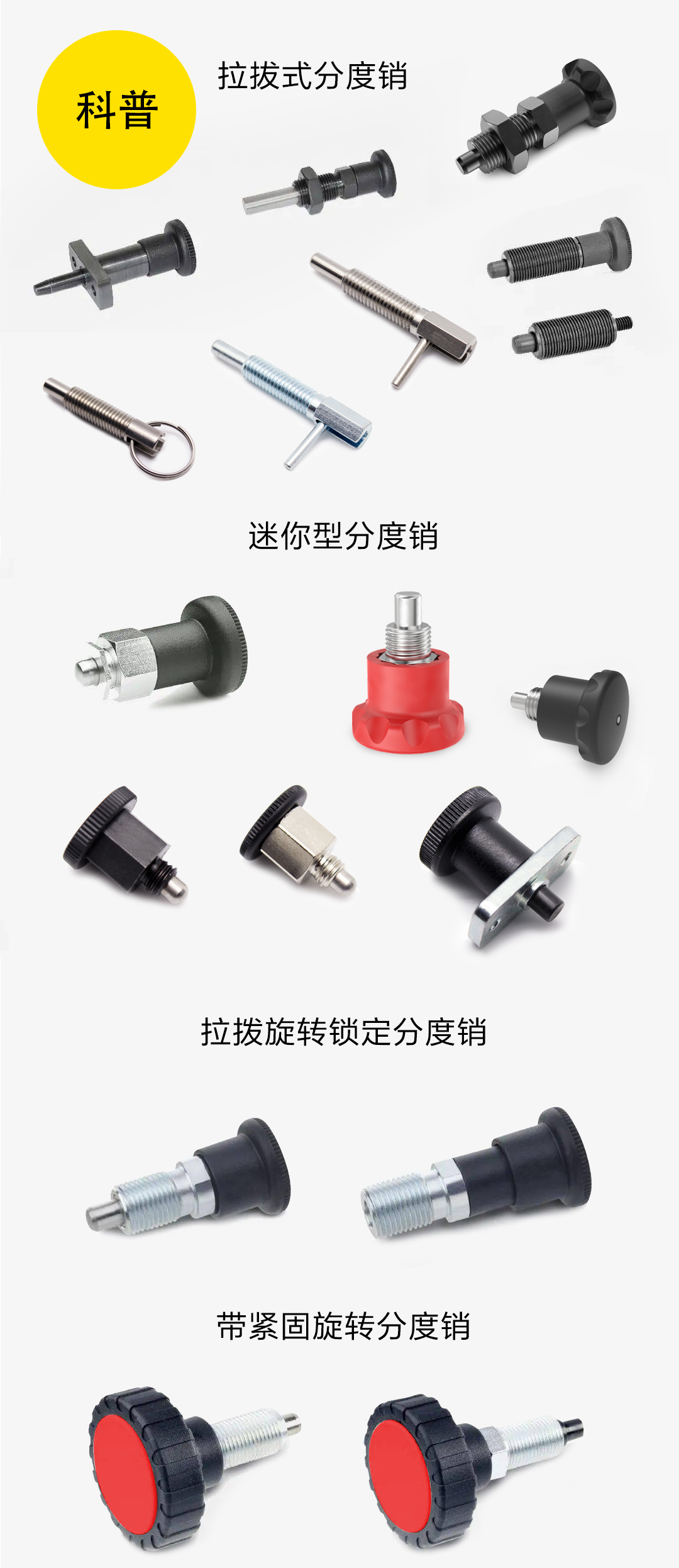 分度銷通常有以下幾類:復(fù)位型分度銷,自鎖型分度銷, 全螺紋分度銷, 短螺紋分度銷, 帶法蘭分度銷, 帶拉環(huán)分度銷, 把手型分度銷, T型分度銷。