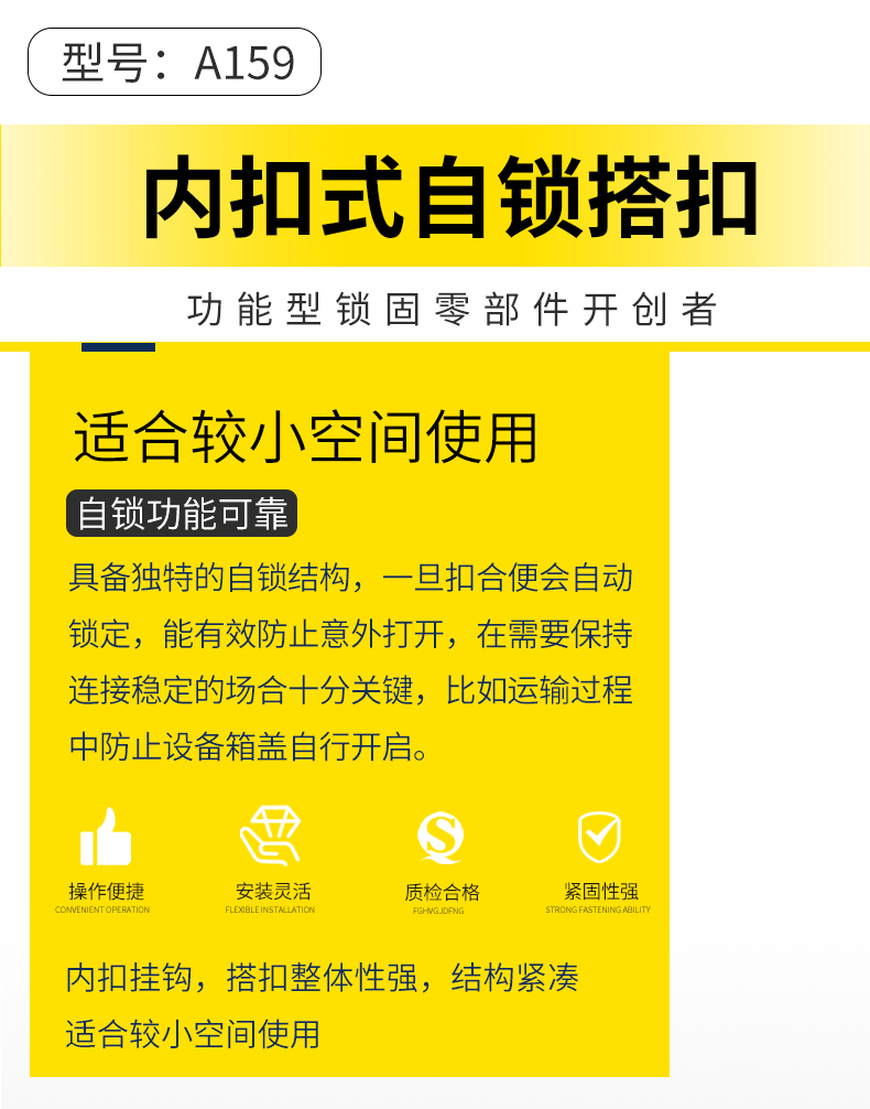 · 操作便捷:開合操作相對(duì)簡(jiǎn)單,只需簡(jiǎn)單的按壓或撥動(dòng)動(dòng)作即可完成扣合與解鎖,可提高工作效率,適合頻繁開合的應(yīng)用場(chǎng)景。
