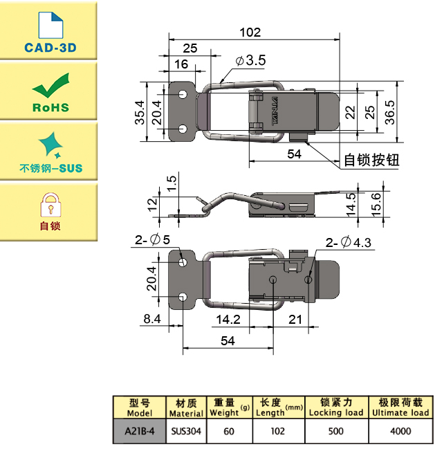 搭扣獨(dú)特的自鎖結(jié)構(gòu)設(shè)計(jì),防止搭扣在使用過程中彈開,使用方便安全。