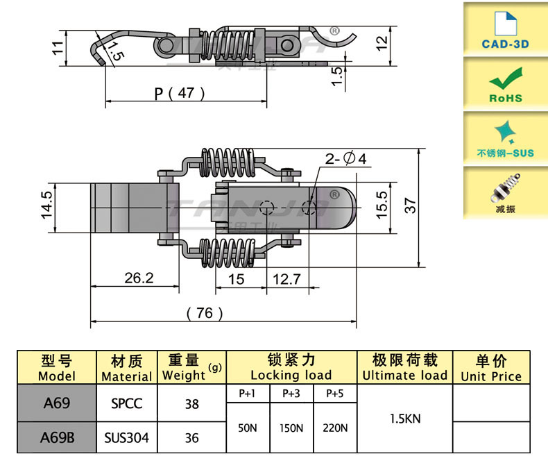 長(zhǎng)度(mm) 長(zhǎng)度(mm) 材質(zhì) 材質(zhì) 重量(g) 鎖緊力(N) 鎖緊力(N) 極限荷載(N) 極限荷載(N) 功能 功能