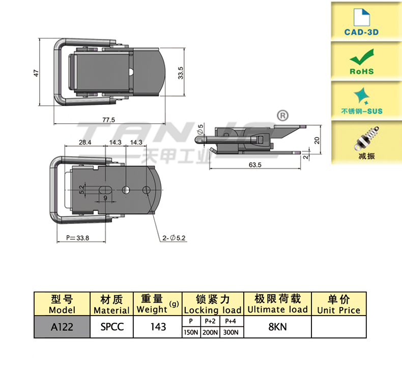 長(zhǎng)度(mm) 長(zhǎng)度(mm) 材質(zhì) 材質(zhì) 重量(g) 鎖緊力(N) 鎖緊力(N) 功能 功能