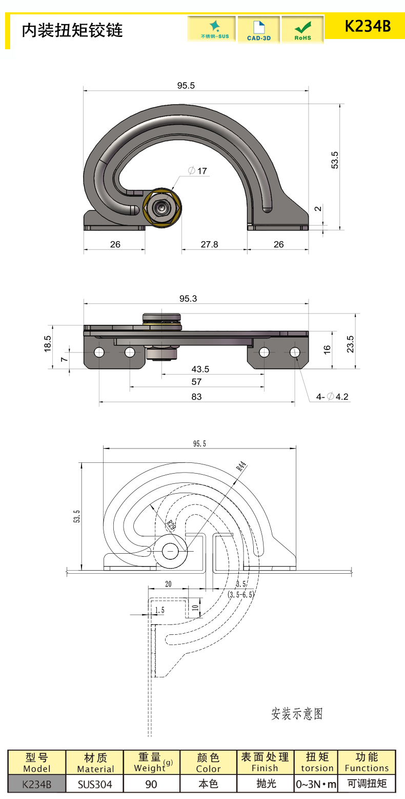 任意停,開合范圍內任意角度皆可定位停止,最大開合角度90°