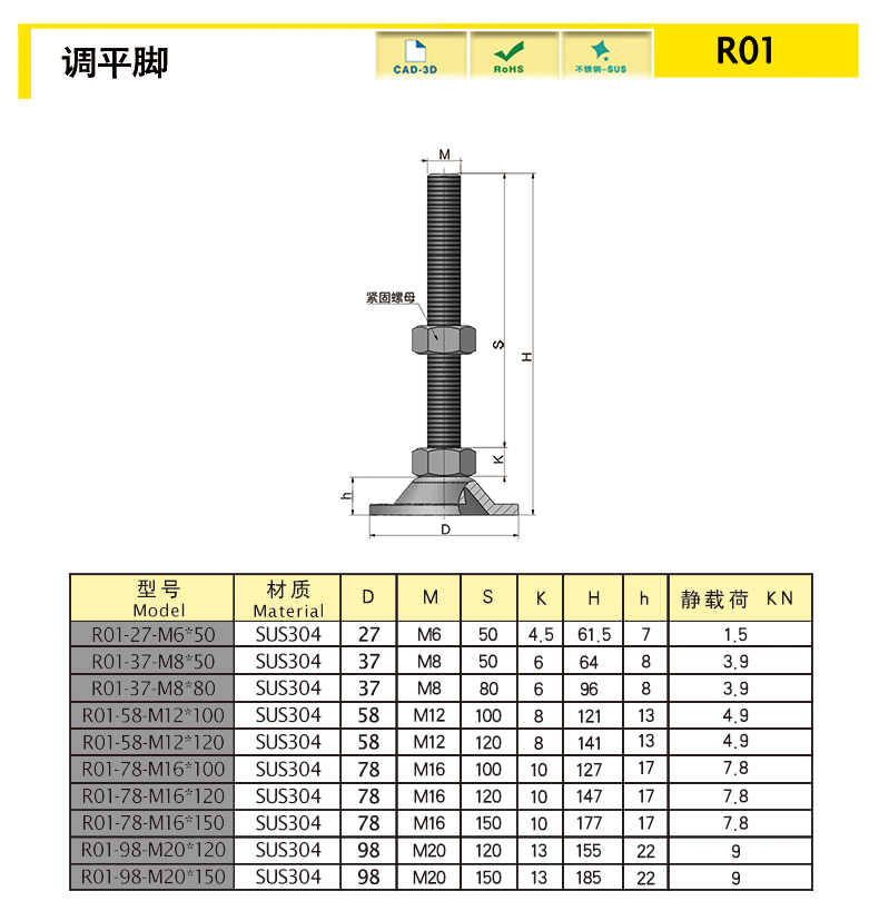 | 型號 | 材質(zhì) | 直徑D | M | S | K | H | h | 重量(g) | 靜載荷(KN) | 3D圖紙 | 選購 | |||