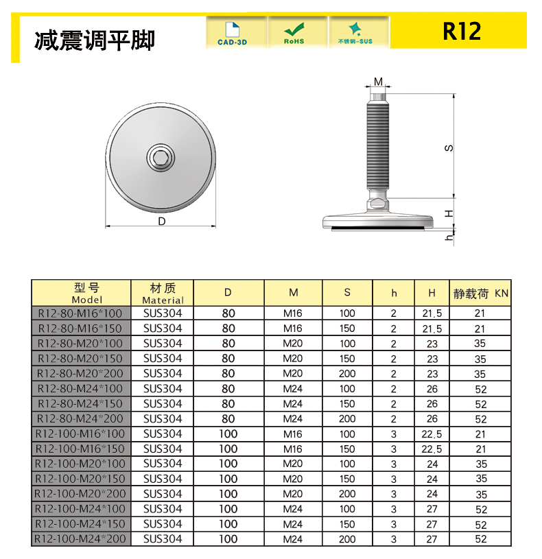 | 型號 | 材質(zhì) | 直徑D | M | S | H | h | 重量(g) | 靜載荷(KN) | 3D圖紙 | 選購 | |||