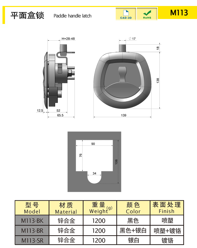 平面盒鎖 鋅合金 139 黑色+銀白 噴塑+鍍鉻 1139.01